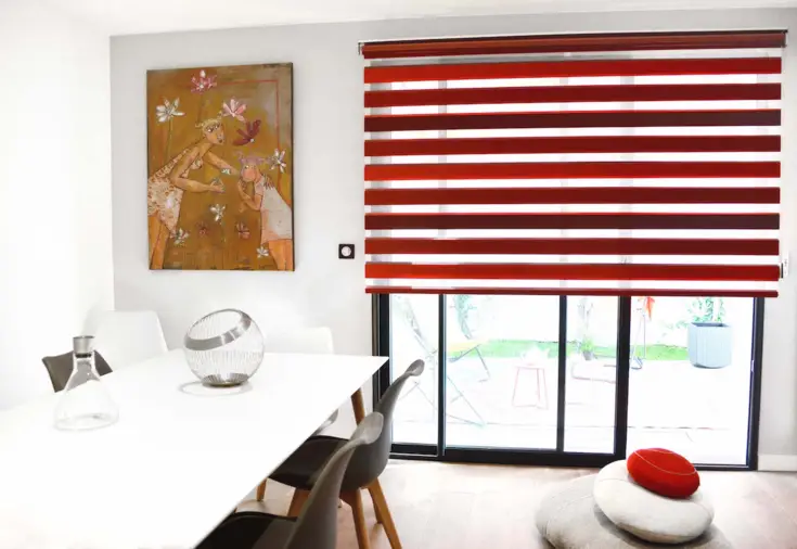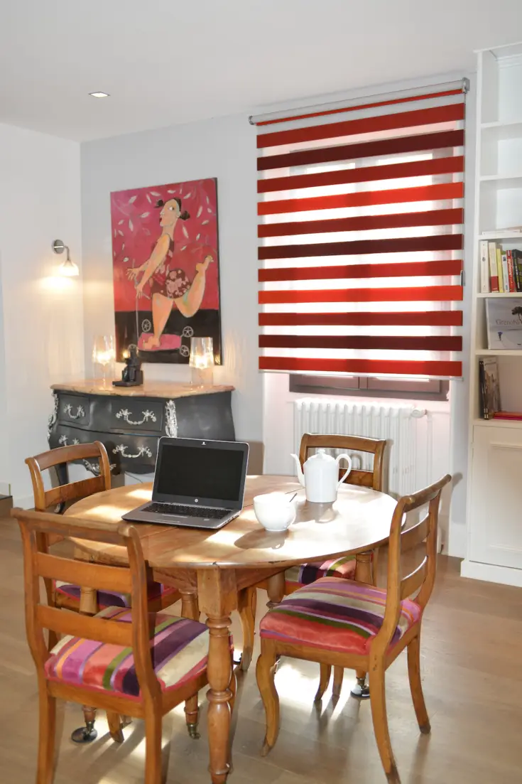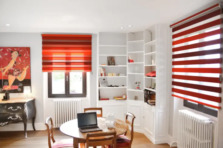 Très efficaces pour protéger des éblouissements sur un écran d’ordinateur comme pour tamiser la lumière, les stores night & day sont ici déclinés dans des tonalités orangées. Ils apportent en plus un esprit déco chaleureux à la pièce de travail, loin de l’aspect froid et industriel des stores de bureaux. Une esthétique qui a son importance pour travailler dans une ambiance cosy stimulante.