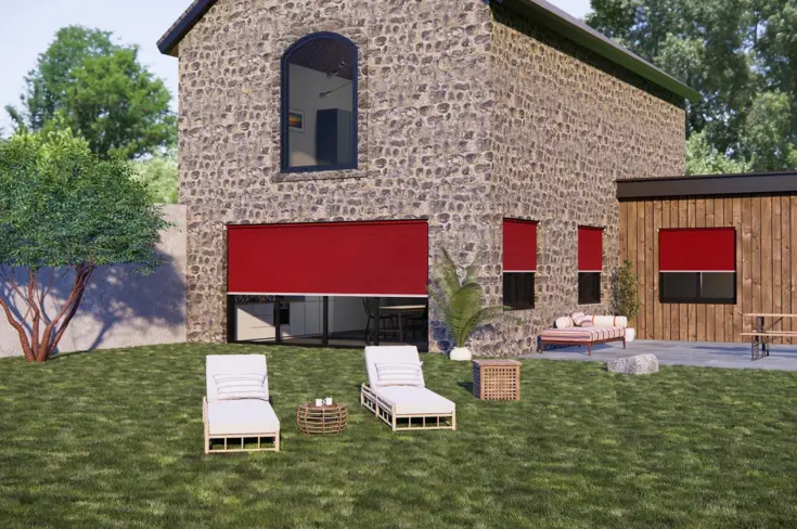 Pour équiper une baie vitrée jusqu’à 5,85 m, on choisira un modèle adapté aux grandes dimensions, comme le store Bannette à projection, qui dispose d’une retombée de 2 m.