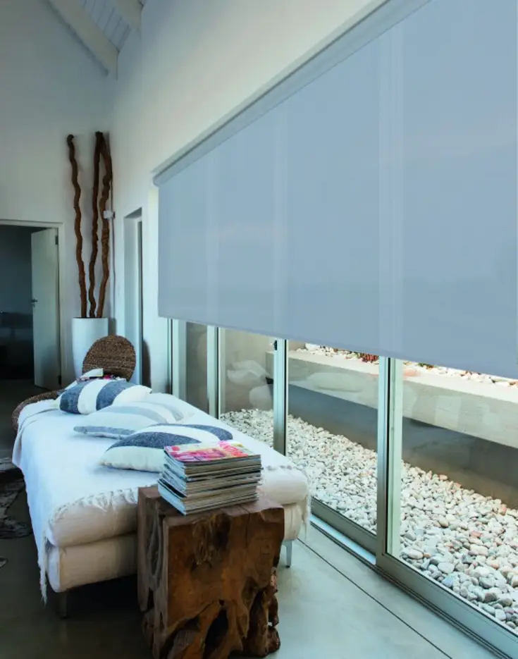 Disponible dans 58 coloris de tissus, métallisés ou non, semi-opaques ou opaques, il assure une excellente protection solaire et peut aussi servir d’occultation.