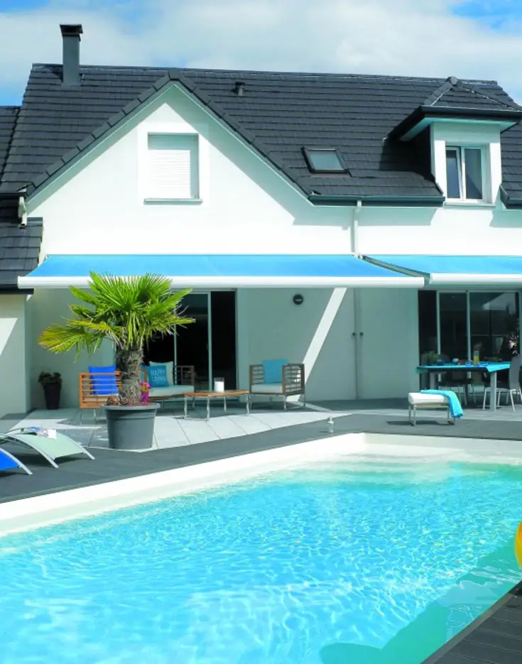 Cette maison bretonne contemporaine comporte une grande terrasse abritée par deux stores bannes pour du soleil et de l’ombre à la carte. La couleur turquoise fait écho au bleu de la piscine et se marie parfaitement avec les tuiles ardoise et la façade blanche. Un rendu lumineux et moderne !