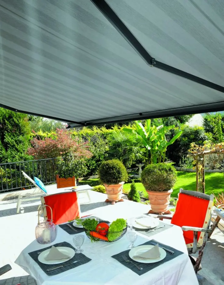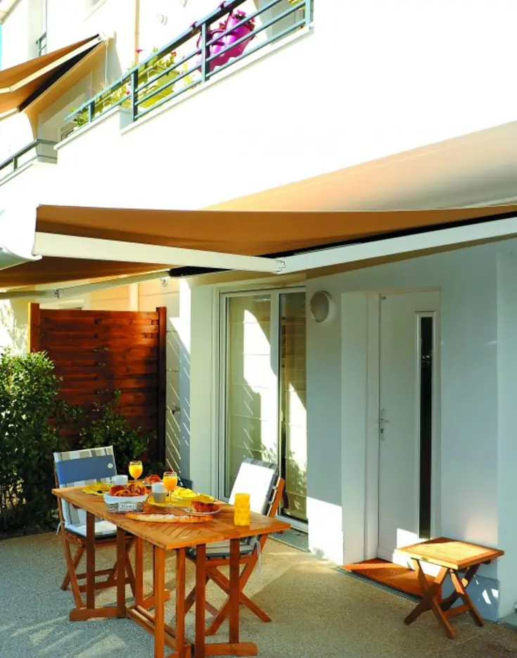 Dans cet appartement avec terrasse, les habitants peuvent prendre leur petit déjeuner en toute tranquillité à l’abri des regards des voisins du dessus tout en étant protégés du soleil grâce à leur store.