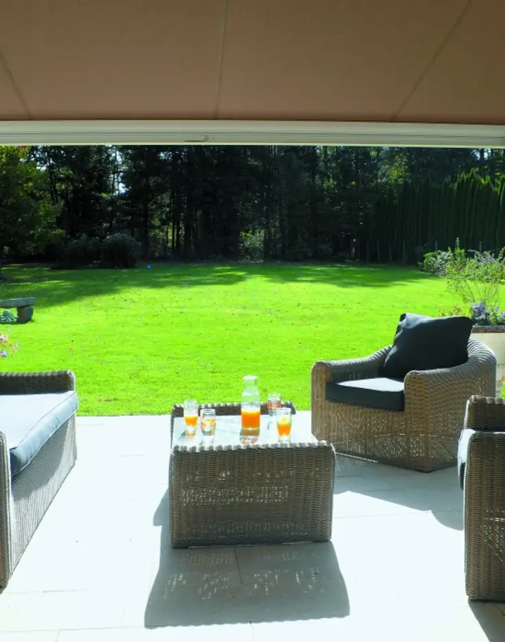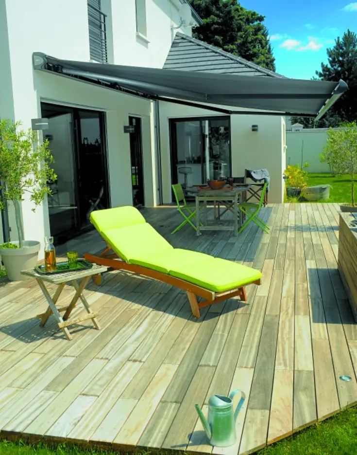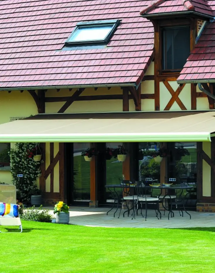 Les hôtes de cette maison normande pleine de charme ont choisi un store banne pour abriter du soleil leur grande terrasse. La couleur taupe se mêle en toute légèreté aux poutres apparentes préservant le style authentique et offrant des moments de détente au frais.