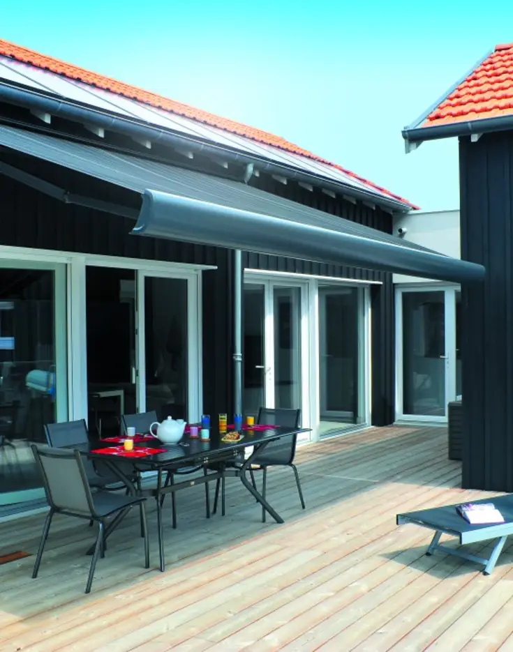 Les propriétaires de cet habitat contemporain ont opté pour un store de terrasse au coffre design. La toile anthracite et ses filets blancs répondent au bardage de la maison pour un rendu harmonieux. Avec son espace repas à l’abri du soleil et sa belle piscine, on se croirait déjà en vacances !