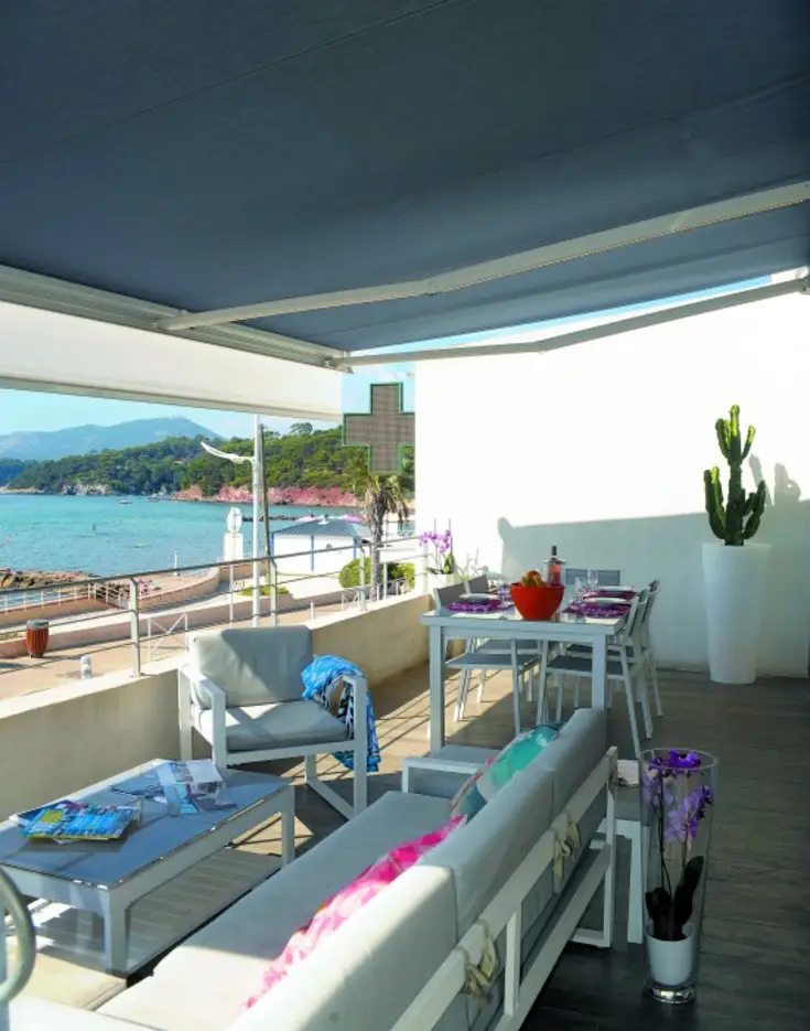 La terrasse face à la mer invite au calme avec, d’un côté, un coin salon pour prendre l’apéritif, et de l’autre, un espace repas, le tout protégé par un store pour passer de doux moments à écouter le bruit des vagues...