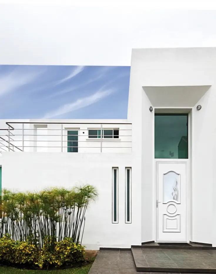 Une porte d’entrée vitrée créera de jolis reflets lumineux à l’extérieur, pour une façade de maison pleine de charme.