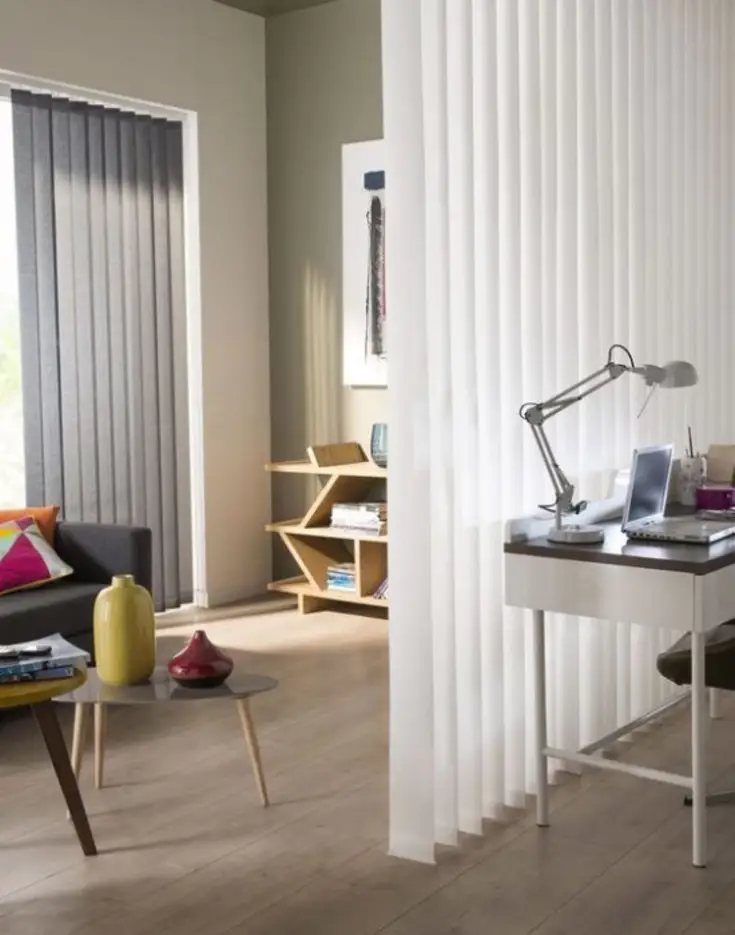 On y pense moins souvent, mais les stores à bandes verticales – ou stores californiens – ne servent pas qu’à donner un look de villa à votre maison. Ils sont souvent placés sur de grandes baies vitrées ; et pour cause : ils modulent la lumière sans assombrir. Ils seront donc parfaits pour séparer une pièce en deux sans aucune perte de luminosité.