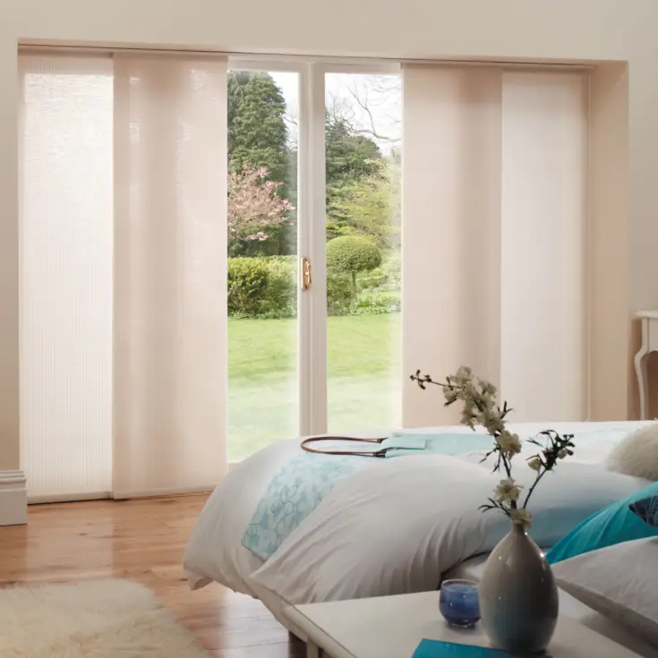 Pour une ouverture exposée au nord ou peu ensoleillée, on peut choisir de l’habiller d’un voilage de grande baie vitrée, qui offrira un rendu aérien. Les panneaux japonais pour grande baie vitrée sont enfin une alternative originale qui affiche des très grandes dimensions : jusqu’à 5 mètres de large et 3 mètres de haut, pour moduler la lumière tout en habillant la baie d’un esprit design épuré.
