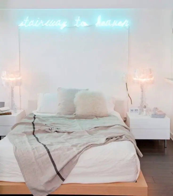 Dans la chambre, le néon s’invite au-dessus du lit comme un tableau. Plus moderne, moins conventionnel et archi tendance, le néon tête de lit est devenu la star d’Instagram et de Pinterest ces derniers temps. On le décline sous formes de messages mais aussi de créations abstraites et sculpturales qui viennent structurer la pièce.