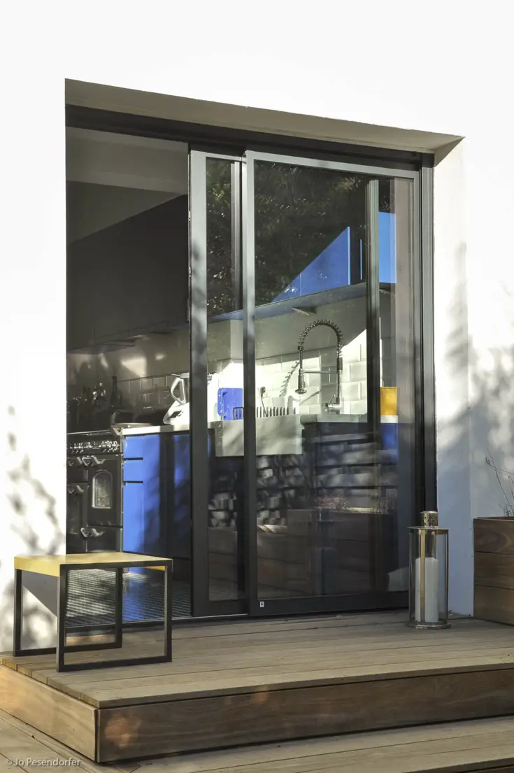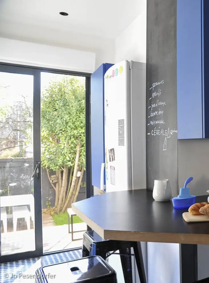 Une extension a été construite sur la façade avant agrandissant la cuisine et créant une terrasse en bois dotée de quelques marches. Les équipes Storistes de France sont intervenues pour installer la baie vitrée Gliss’alu Premium aux profils gris anthracite. Elle a permis de sublimer cette pièce en lui apportant lumière, sensation d’espace et un esprit loft. Coup de foudre pour la décoration qui allie modernité, avec sa cuisine bleu pop à la finition mate et son bar sur-mesure et tradition grâce à la crédence blanche façon métro parisien, ses carreaux de ciment au sol et son tableau ardoise qui rappelle ceux de l’enfance. L’accès à la terrasse est pratique pour des petits déjeuners ensoleillés avec toute la joyeuse tribu !