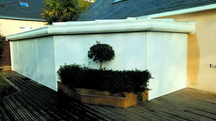 Cette véranda imposante a su trouver des volets qui la subliment, la sécurisent et la préservent de la chaleur. Parfaitement adaptés à la forme des fenêtres, ces volets roulants sont équipés d’un coffrage élégant, pensé comme une corniche, qui ajoute un charme supplémentaire à cette pièce de lumière.