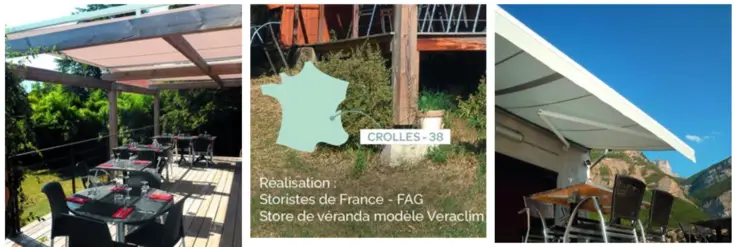 Notre situation géographique nous offre un panorama magnifique sur la chaîne de Belledonne et sur la dent de Crolles. Nous voulions offrir à nos clients un cadre unique et apaisant, notre choix s’est porté sur un store de terrasse et un store de véranda pour compléter notre structure en bois.