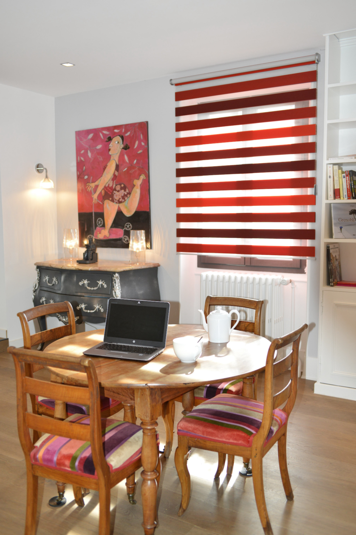 Ici, notre client a choisi de s’installer dans la petite salle à manger, qu’il affectionne tout particulièrement, pour bénéficier d’un éclairage naturel en double exposition, mais aussi modulable grâce à des stores à enroulement night & day. Les placards de la bibliothèque ont été récupérés pour créer des rangements accessibles, et les chaises d’époque «ultra-confortables » avaient déjà été approuvées depuis de nombreuses années.