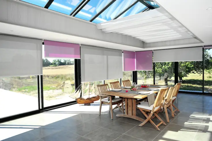 Une extension à toit vitré dans un esprit véranda permet un maximum de luminosité. Cependant, pour vous protéger des rayonnements trop intenses et de la chaleur, il faut penser à l’équiper de stores intérieurs, indispensables à la régulation de la lumière. Les stores Velum créent par exemple un effet drapé élégant et protègent thermiquement votre espace de vie.