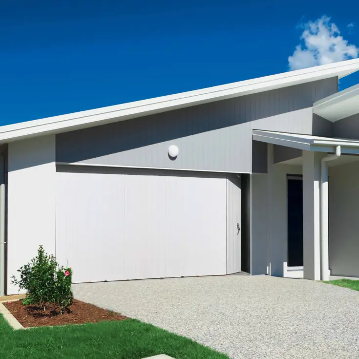 Économique, la porte de garage coulissante est un modèle classique avec portillon intégré, qui coulisse grâce à des rails latéraux en partie haute et des sabots en partie basse. Elle convient aux garages larges qui disposent d’un passage suffisant sur les côtés.