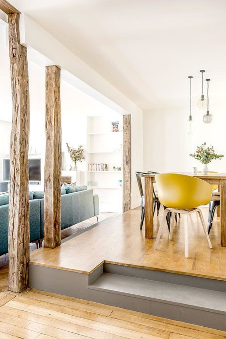 Aucun cloisonnement ici, vous conservez une grande pièce ouverte. Pourtant, vous verrez que l’estrade donne une sensation de cocon. Vous pouvez aussi installer quelques escaliers pour créer un effet duplex.