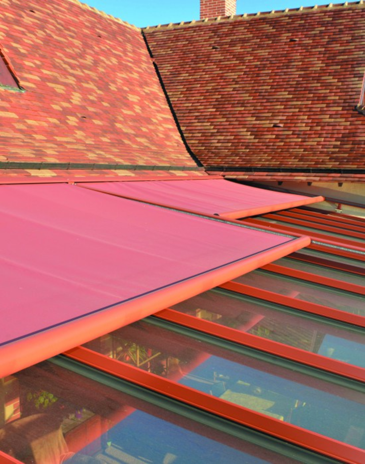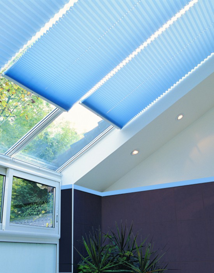 Le store plissé Vélum : Adapté aux toitures de vérandas inclinées, il se remonte à la hauteur souhaitée avec une perche ou une télécommande permettant de moduler à la carte la lumière. Il se décline dans plus de 90 tissus décoratifs répondant ainsi à tous les goûts. Pour renforcer les performances thermiques, optez pour la technologie Plisign, un tissu plissé doublé, avec à l’intérieur une feuille d’aluminium qui emprisonne la chaleur ou le froid et offre une isolation thermique supplémentaire.