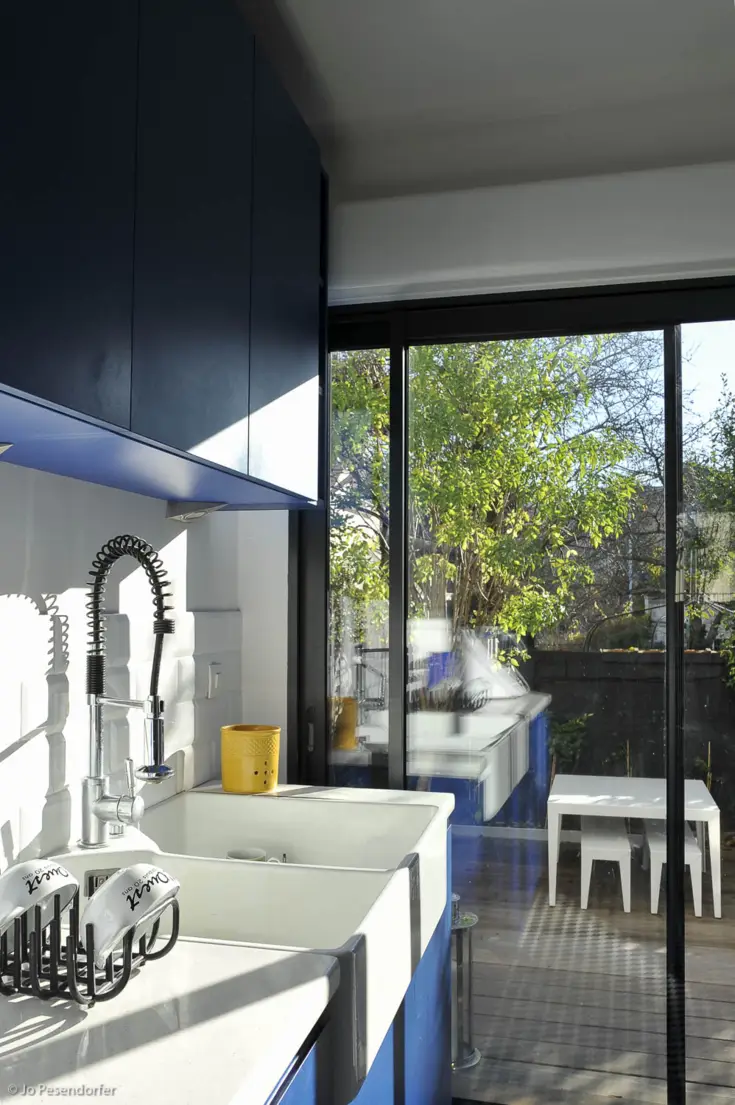 Une extension a été construite sur la façade avant agrandissant la cuisine et créant une terrasse en bois dotée de quelques marches. Les équipes Storistes de France sont intervenues pour installer la baie vitrée Gliss’alu Premium aux profils gris anthracite. Elle a permis de sublimer cette pièce en lui apportant lumière, sensation d’espace et un esprit loft. Coup de foudre pour la décoration qui allie modernité, avec sa cuisine bleu pop à la finition mate et son bar sur-mesure et tradition grâce à la crédence blanche façon métro parisien, ses carreaux de ciment au sol et son tableau ardoise qui rappelle ceux de l’enfance. L’accès à la terrasse est pratique pour des petits déjeuners ensoleillés avec toute la joyeuse tribu !