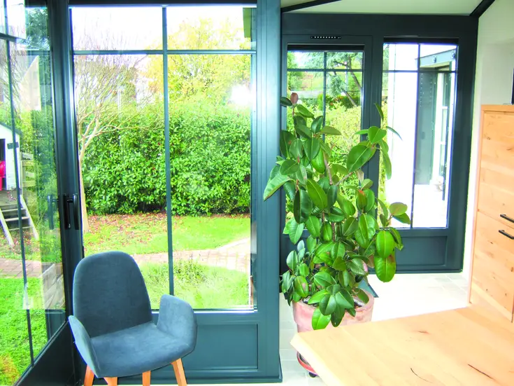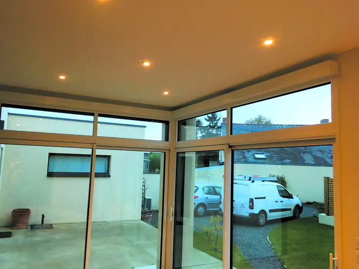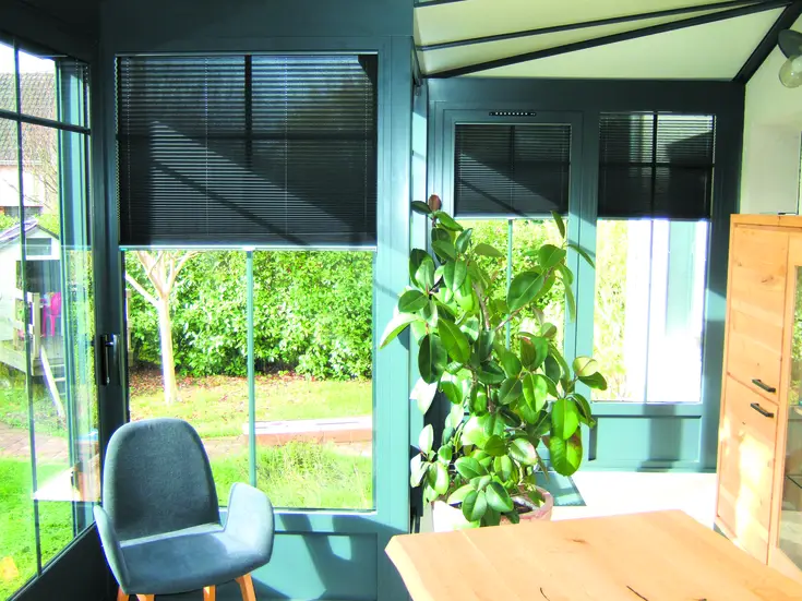 Pour contrôler la luminosité de la pièce et pouvoir se préserver des regards, les propriétaires ont misé sur des stores enrouleurs de grande dimension qui couvrent toute la surface vitrée. L’astuce ? Choisir un motif déco qui créera une pièce cocon lorsque les stores seront baissés.