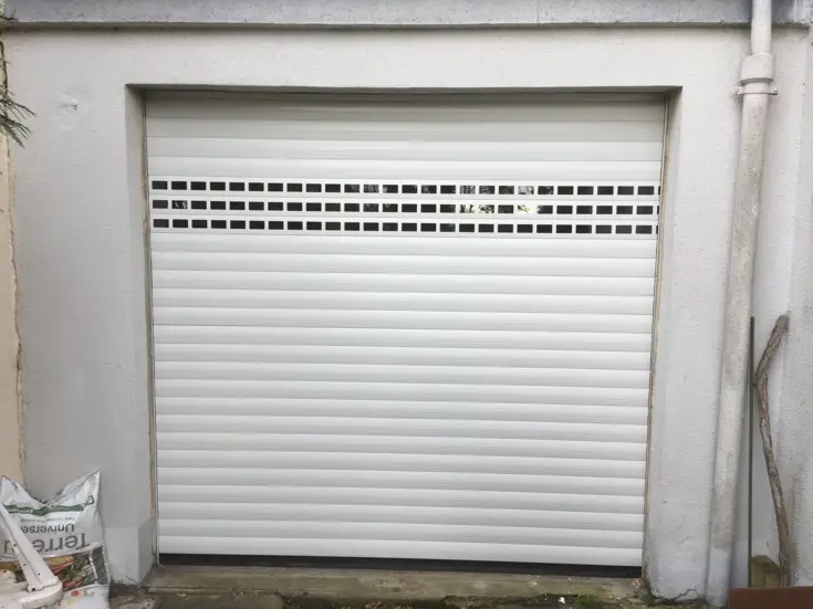 Comme un volet roulant, cette porte s’enroule dans un caisson compact préservant l’espace utile dans le garage. Les lames en aluminium isolent bien du froid. En cas d’obstacle, la descente s’arrête automatiquement protégeant la porte et l’obstacle ! Les propriétaires ont choisi un blanc pur qui sublime et illumine la porte et s’harmonisent facilement avec le reste. Des petits hublots viennent compléter et apportent de la lumière naturelle à l’intérieur.