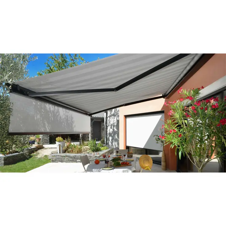 Quel que soit le style architectural de votre maison, le store de terrasse Corfou avec son esthétique raffinée mais sobre, répondra à votre besoin. Sa structure robuste vous offre un vaste choix de coloris, tandis que ses toiles d’excellente tenue, qu’elles soient unies, à rayures ou à motifs, s’ajustent à tous les goûts et à toutes les gammes de prix. Son plus : parfait pour protéger les grandes terrasses.