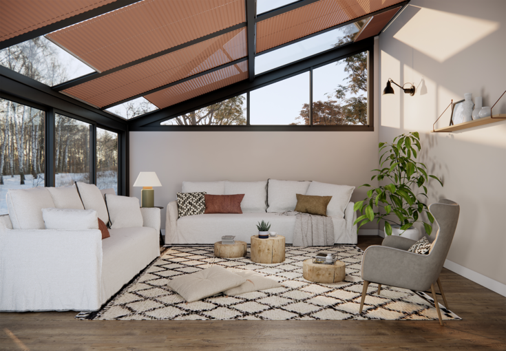 A l'intérieur, privilégier des tissus plutôt clairs permettant de réfléchir l'énergie solaire et de renvoyer la chaleur vers l'extérieur. Placés à l'intérieur les tissus les plus performants présentent un facteur solaire d'environ 35% (c'est-à-dire que 35% de la chaleur entre dans la pièce).